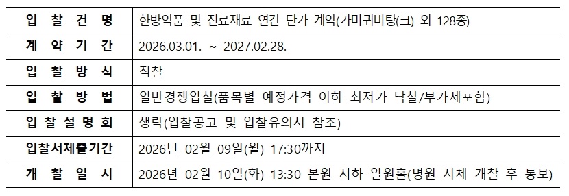 한방약품 및 진료재료 연간 단가 계약(가미귀비탕(크) 외 128종) 입찰공고