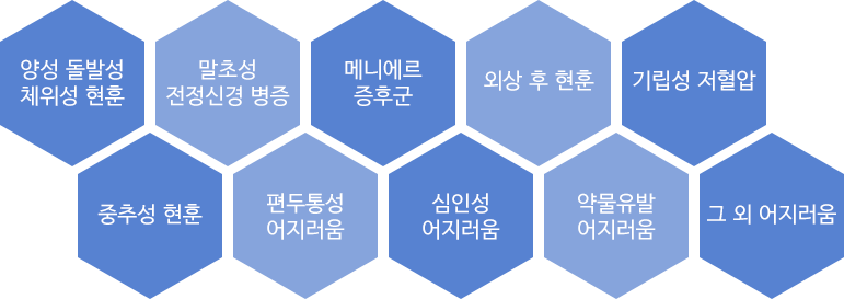 어지럼증은 자세한 병력 청취 후에 평가를 위해 다양한 검사를 시행합니다. 또한 신경학적 원인과 전신적 원인을 확인하기 위해 의과대학병원과 협진하여 제반 보조 검사를 시행할 수 있습니다.